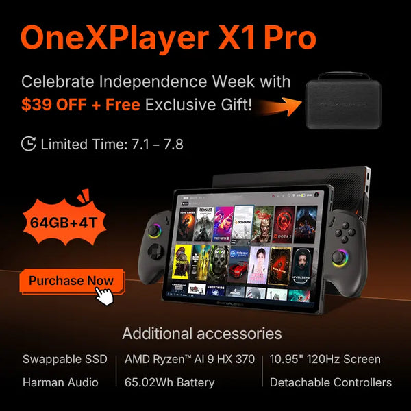 Intro Performance Onexconsole Battery Panel Cooling Harman Sound System Security Design Connectivity Your browser does not support the video tag. OneXPlayer X1 Pro: The Modular Gaming Powerhouse with Unrivaled Display.Learn more about Design >AMD Ryzen AI 9 HX 370: Unleash Next-Level Gaming & Creation.Learn more about Performance >OneXConsole: Your All-in-One Command Hub for Ultimate Handheld Control.Learn more about OneXConsole >OneXPlayer X1 PRORedefining Gaming Handheld PERFORMANCEX1 features the latest AMD Ryzen™ AI 9 HX 370 with Zen5+Zen5c architecture, RDNA 3.5 graphics, and TSMC 4nm process. With 12 cores, 24 threads, 36MB cache, and an 890M GPU, it delivers powerful performance for AAA gaming and productivity. The elite high-performance processor for handheld gaming4nm Process technology5.1GHz Max boost frequency12cores 24threads80TOPS AI total power36MB Total cache50TOPS Al computing powerGPUArchitecture: RDNA 3.5 Compute Units (CU): 16 (+33% vs previous gen) Stream Processors (SP): 1,024 (+33%) Boost Clock: 2.9 GHz.LPDDR5X1 PRO’s 10.95-inch 2.5K touchscreen delivers vibrant colors and smooth 120Hz visuals, offering sharp detail and immersive handheld gaming.SSDM.2 2280 PCIe 4.0 NVMe SSD Reading speed:7114.06MB/S Write speed:6501.54MB/S (Lab results. Actual performance may differ).X1 PRO (AMD AI 9 HX 370) vs AMD 8840UX1 PROAMD 8840UCyberpunk 20776555Black Myth: Wukong7662Horizon: Zero Dawn8870Tomb Raider9481Far Cry 510083RDR27461GTA V10090AC Valhalla7965Warzone8972Elden Ring8468020406080100Advanced OCulinkX1 PRO features a native OCulink port with up to 63Gbps bandwidth, enabling high-speed connections to external GPUs and other advanced devices. It ensures smooth, reliable performance for both gaming and productivity. Your browser does not support the video tag. ONEXCONSOLEAdd games to your Game LibraryIf your installed game does not appear in the library, please select “Add” to add the game mamuallyIf you have not installed any games yet, check out from Setting > Game PlatformsSuper Game LibraryGame Library is a powerful, custom-built feature in OneXPlayer special Customized system OneXConsole, designed to elevate your gaming experience. With just one touch, instantly summon your game library, effortlessly managing and launching all your favorite titles for a seamless and immersive gaming experience.Slide DownGame libraryThe game library has an intelligent recognition function that can quickly identify and manage online games installed on the device. At the same time, it also supports manual addition of local games to the library and allows players to customize cover images for these games to add personalization.Setting PanelHere you can quickly adjust power consumption, fans, vibration, RGB ambient lights, performance detection, etc. Switch and set gyroscope parameters, lock frame, game modifier, etc.Cloud StorageOneXConsole’s cloud sync seamlessly preserves game progress across OXP2/PRO, ONEXFLY and X1 G1 series. Automatically uploads saves via WiFi with 256-bit encryption, eliminating manual transfers. Supports Steam/Epic/PC games, ensuring continuity between home and portable play. Protects hundreds of gameplay hours from device failures, letting gamers switch hardware freely without replaying content. Designed for multi-device owners, it maximizes gaming efficiency across the ecosystem.CustomizationUsers can change the controller button functions in this module, set custom button functions, and set unique secondary functions for each button.BATTERYNon-stop Gaming and ProductivityThe OneXPlayer X1 PRO boasts a 65.02Wh battery for extended playtime, fast charging with a 100W GaN charger, and efficient power management—ideal for non-stop gaming and productivity65.02Wh. Your browser does not support the video tag. PANELUnleash True Visual BrillianceThe X1 PRO features a 10.95-inch 2.5K touchscreen with a smooth 120Hz refresh rate, delivering crisp visuals and vibrant colors. Perfect for handheld gaming, it offers sharp detail and true-to-life clarity for an immersive experience. Your browser does not support the video tag. COOLINGThe X1 handheld features an advanced cooling system with precision thermal management, ensuring stable performance during intense gaming sessions. Stay cool, play longer, and enjoy uninterrupted, top-tier gameplay. Your browser does not support the video tag. Hydraulic Bearing FanDelivers up to 5.9 CFM airflow and 4,300 RPM speed with a max noise level of just 39.4 dBA, providing efficient cooling with minimal sound for uninterrupted gaming.Large Aluminum Heat SinkFeatures a massive 15,400 mm² dissipation area, rapidly conducting heat away from key components to maintain stable performance during extended high-load sessions.Dual-Channel Cooling DuctOptimized design with 90% dual-channel separation and 45% vent opening rate improves airflow efficiency and internal cooling for consistent temperature control.Honeywell Thermal CompoundHigh-performance CPU thermal solution with 8.5 W/m·K conductivity enhances heat transfer from processor to heatsink, improving overall thermal efficiency and longevity.Graphene Thermal PadsOffers up to 3000 W/m·K thermal conductivity for memory and SSDs, ensuring effective passive cooling and peak stability in compact handheld gaming systems.IC Cooling Copper PlateCritical inductors and ICs are cooled using thermal pads and a copper sheet with 400 W/m·K conductivity, enhancing durability under heavy workloads.HARMAN SOUND SYSTEM Your browser does not support the video tag. Stereo 2.0Design≤5% @300+HzTotal Harmonic Distortion300Hz~14kHzFrequency Response12x27mmHarman Full-Range Speaker Units≥90dB @0.1m-13dBFSSensitivityCustomized Closed-BoxHigh-Frequency ExtensionSECURITY Your browser does not support the video tag. Fingerprint unlockFingerprint sensor in the power button for swift unlock and secure access within just one touch. Your browser does not support the video tag. Facial recognition unlockThe aut